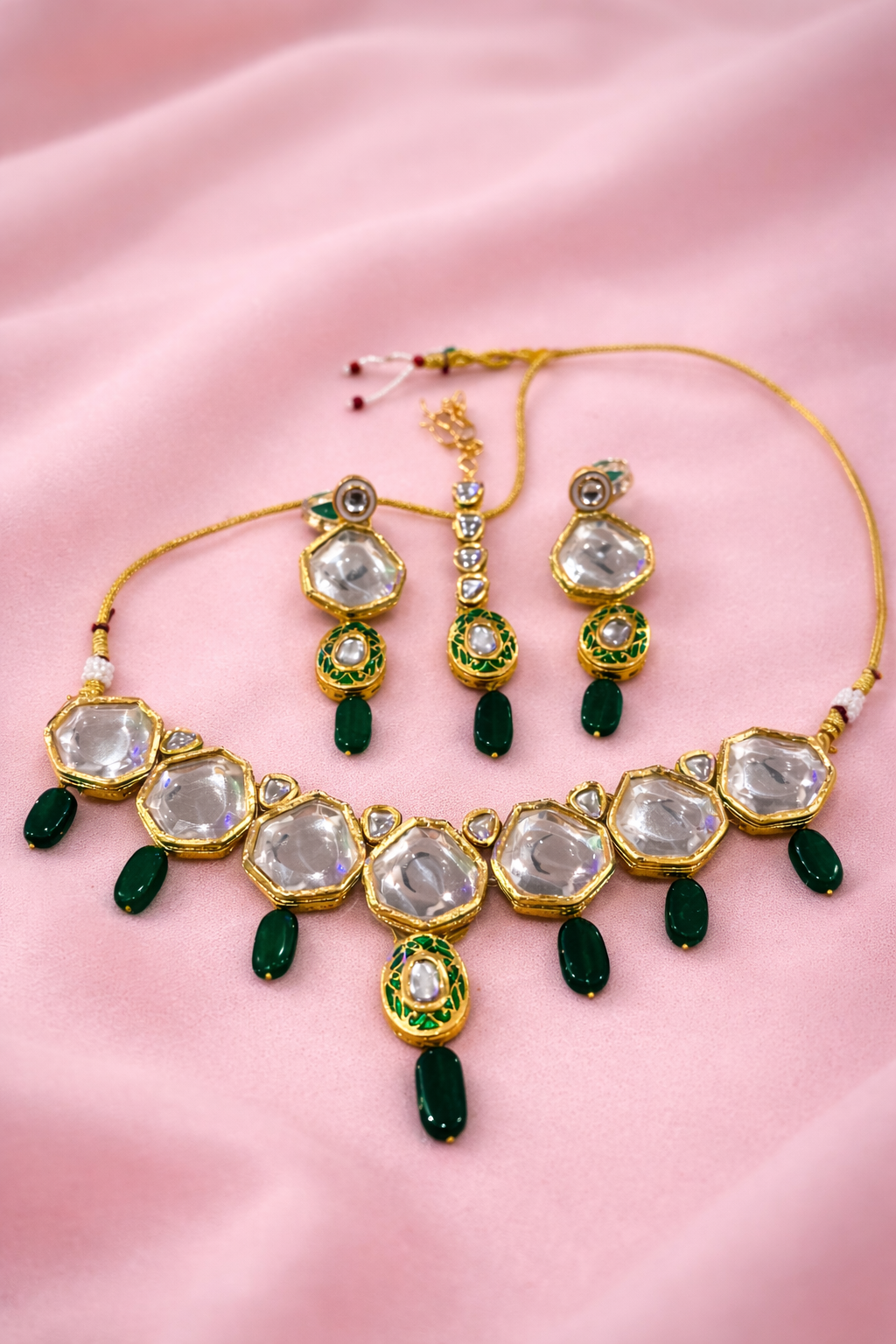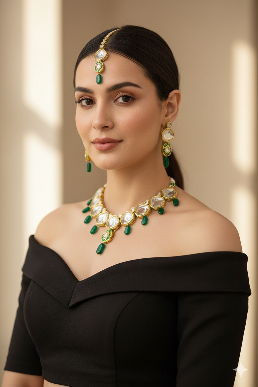 Green Jade Single layer Gold Plated Kundan Jewellery with Mangtikka